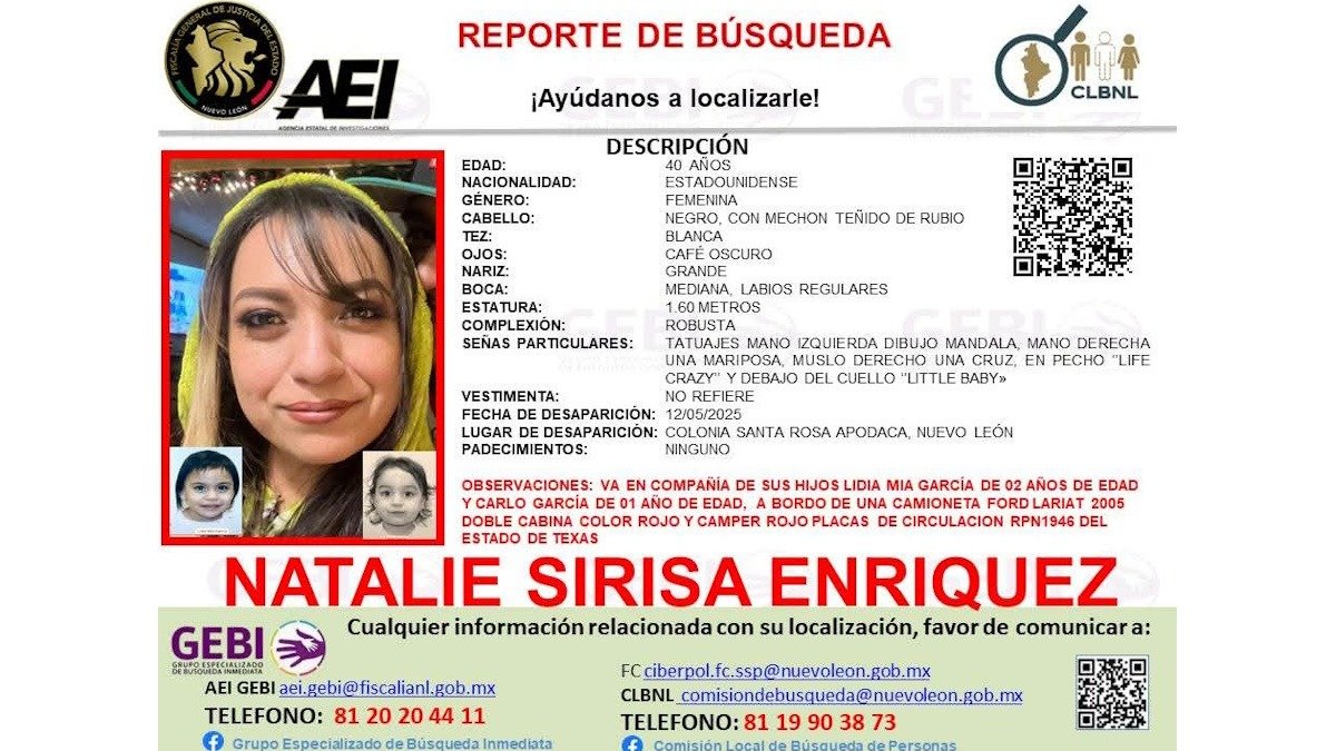 La Fiscalía de Nuevo León emitió un reporte de búsqueda para una mujer de nacionalidad estadounidense desaparecida en el municipio de Apodaca junto con sus dos hijos menores de edad.