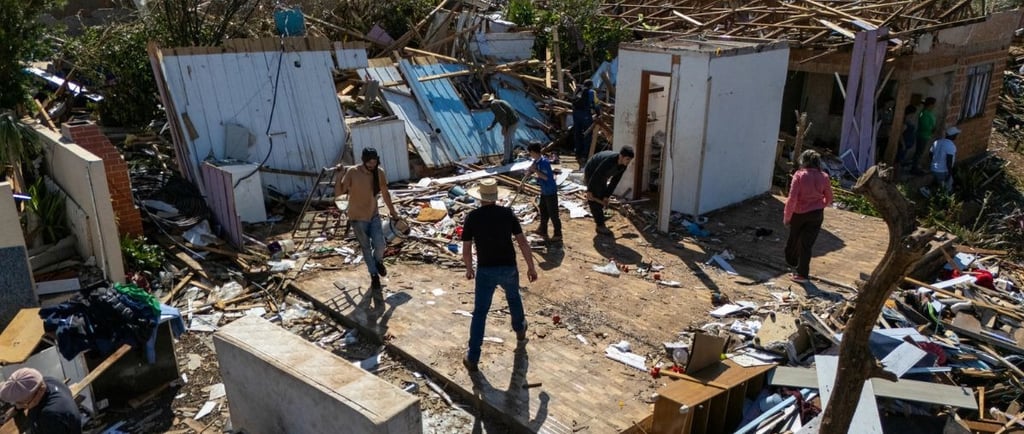 El tornado con una intensidad sin precedentes en el sur de Brasil, con vientos de hasta 250 kilómetros por hora y tormenta de granizo, arrasó la ciudad en menos de dos minutos y provocó daños en 704 construcciones, arrancó cientos de árboles y postes del tendido eléctrico y volteó numerosos vehículos.